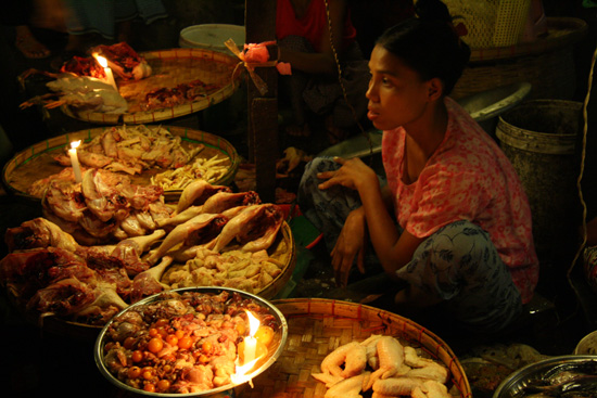 We venture into one of Yangon’s larger markets: there are no money changer’s stalls, you simply wander round for long enough and they’ll find you. The rate is unbelievably volatile: on the night we arrive, the best rate is around 930 kyat to the dollar; by the next day, we agree on 980 kyat / dollar with one of the more reputable looking gentlemen who approach us.