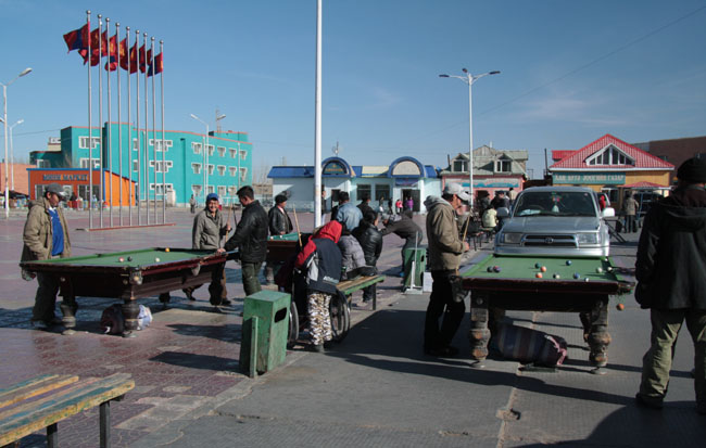 After a quick nap we wander through the market square where hardy locals are playing pool, of all things, on three outdoor municipal tables. Local girls in tight jeans and trendy coats chatter in groups; older, weather-beaten men in sturdy leather boots and patched up wax jackets watch the youngster play pool. The piercing wind doesn’t seem to bother them – as far as they’re concerned this is a mild spring day. They’re made of stern stuff, these Mongolians.