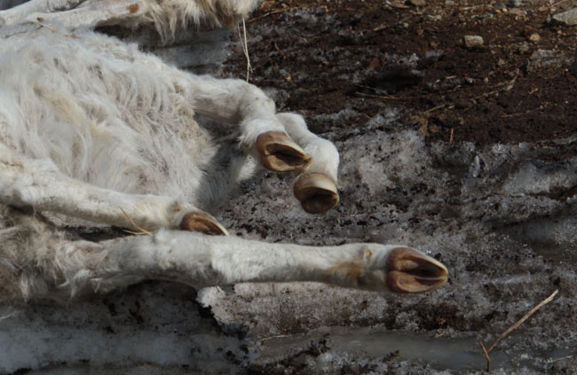 Within minutes, we start to see the after-effects of the harsh winter: a zud. Zuds are livestock famines caused by hard winters or over-grazing – either the snow is so heavy that the grass is totally covered, or a late freeze hampers water supplies, or heavy snow diverts too many animals to the same areas, so trampling the wet grasslands and destroying scarce food supplies.