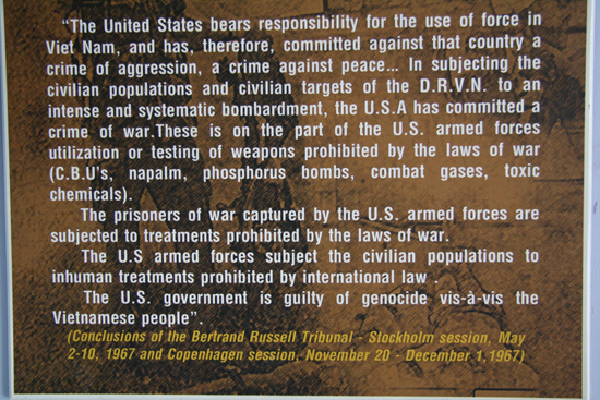 There are numerous one-sided references to the ‘illegal war’ which is probably a little far-fetched given the world-wide intensity of the Cold War at the time, but the American’s trial and widespread use of chemical warfare, dioxins and defoliants, coupled with the largest carpet-bombing campaign in history (across Laos and Cambodia as well as Vietnam) would be inexcusable in any context.
