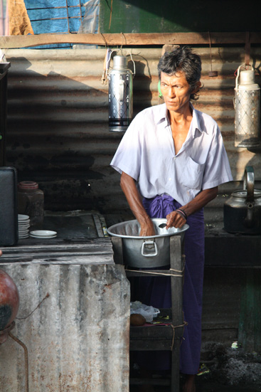 It consists of one serving table covered with small bowls containing a variety of cold an oily Burmese curries, a tin kettle over a charcoal fire pail and half a dozen of so minute sets of plastic tables and chairs, once brightly coloured, now faded and covered in grime.