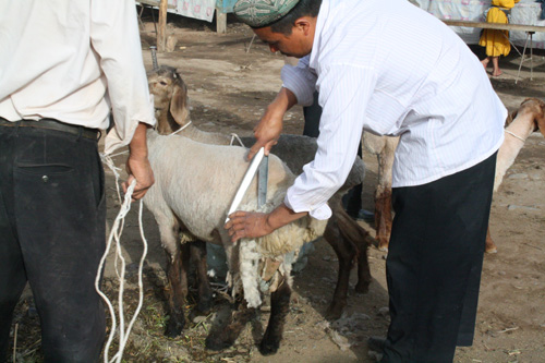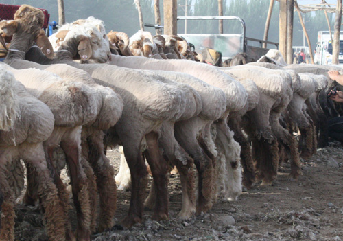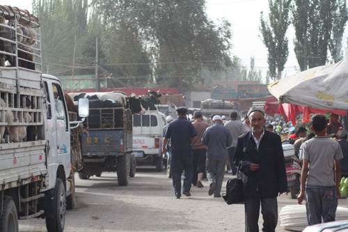 On August 9th, we drop in to see the famous Sunday animal market before departing Kashgar. It is the largest such market in Central Asia, drawing tens of thousands of traders every Sunday. It is indeed a seething, pungent mêlée of sheep, cattle and donkeys, plus the occasional camel, all being traded furiously by their Uighur owners.