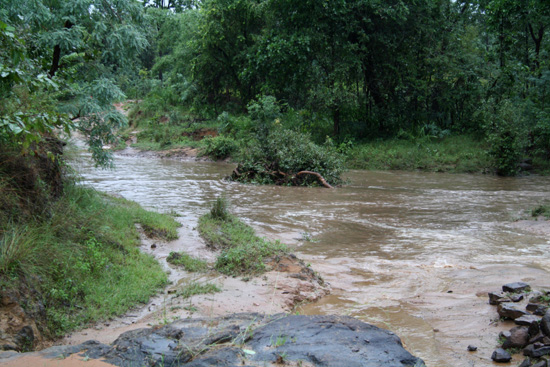 Thankfully, our car does us proud. The road is now more akin to a treacherous stream of mud and sand, but we confidently slip and slide our way through. An astonished local, tending his cows, watches open mouthed as we drive through a river that was three feet deep last night; now it is over four feet. We have officially christened our snorkel…