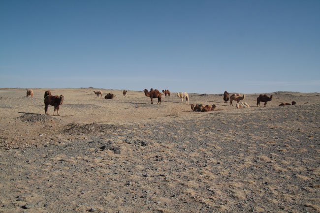 Actually, the Gobi Desert supports a surprising amount of life, given the hostility of its environment. Within a few minutes we’ve spotted our first herd of wonderfully woolly Bactrian camels, flocks of sheep, goats and hardy desert ponies all follow. All are a sign of nearby human life; indeed every half hour or so we drive past low-lying ger (yurt) encampments comprising a handful of field-mushroom like tents, aerodynamically hugging the sand.