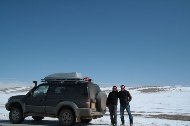 Leaving Choir, the change in climactic conditions and landscape is severe. We’d noticed progressively larger patches of snow as we headed north yesterday, but today we are immediately, and permanently, surrounded by white-blanketed plains. We’re glad the tarmac is here; driving on tracks through this would be slow and treacherous (although it makes us wonder what we have in store when we leave UB and head west).