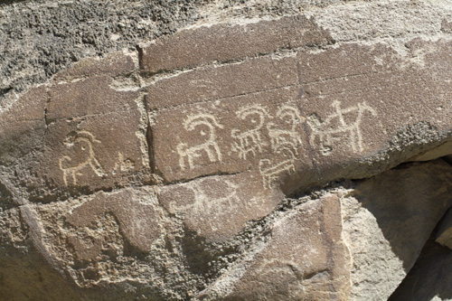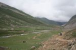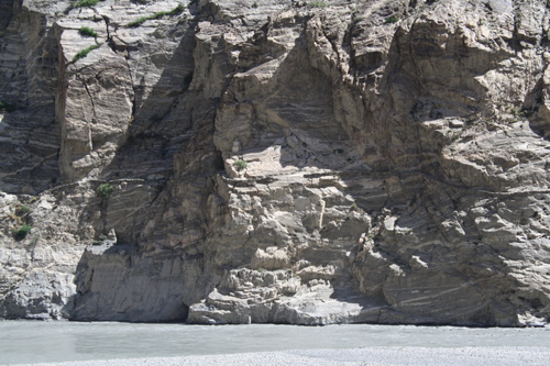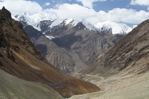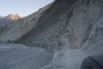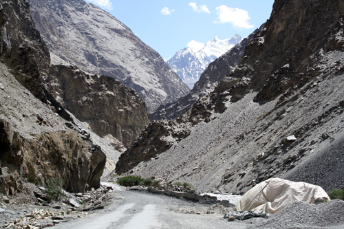 From the top of the pass the road carves an impossibly narrow and treacherous line down the Khunjerab Gorge, surrounded on either side by innumerable rocky and snow clad peaks, most over 6,000m and some well over 7,000m. It is stunning, yet austere scenery – there is no vegetation here and the steep gorges lead to numerous rockfalls and landslides making mincemeat of the road.