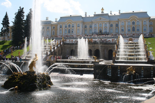 Below the palace, innumerable fountains powered by gravity alone, cascade their way majestically towards the sea, perpetually witnessed by an army of gold statues: Venus and a multitude of gods, cherubs, lions, fish and frog all angrily spume forth water into the principle channels of the fountains.