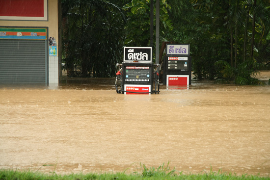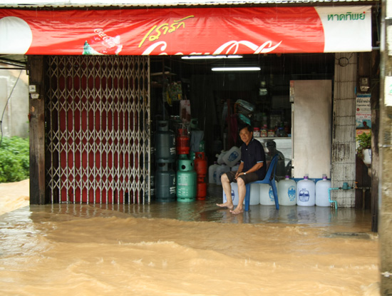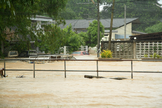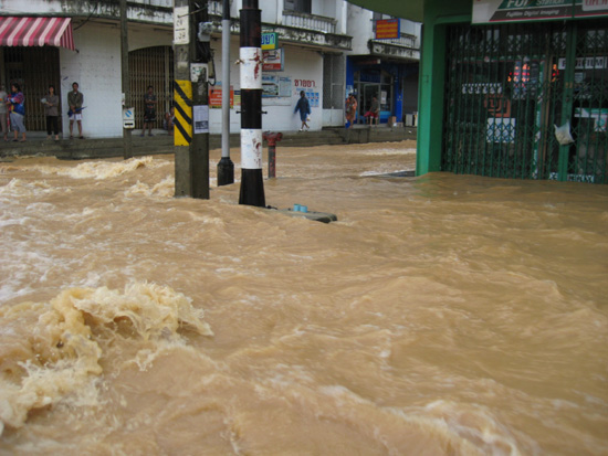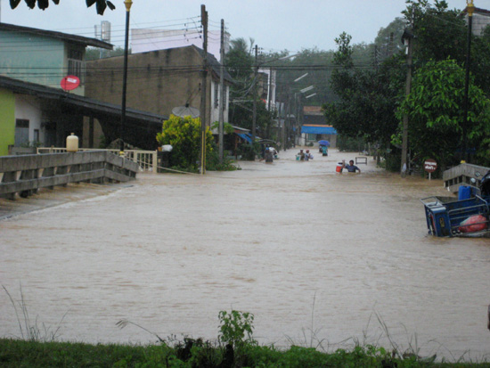 The first real excitement we come across is the little town of Khlong Ngae, which would be totally nondescript if it wasn’t submerged between four feet of fast flowing water. A nearby river has broken its banks and has engulfed most of the neighbourhood, wreaking havoc for the locals but at least making the place memorable for us.