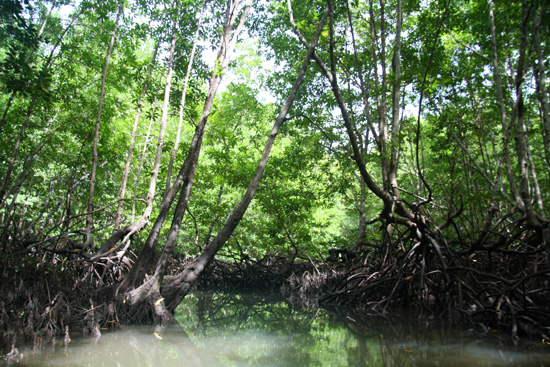 Mangrove swamps must be among the most impenetrable terrain on earth: dense, spiralling masses of stilt roots and the mangrove’s specialised breathing tubes all covered by a thick dark green canopy. At low tide, the roots are revealed, burrowing into great deposits of treacherous sea silt. At high tide, all is submerged, but the roots are so dense that not even the narrowest canoe can pass between them.
